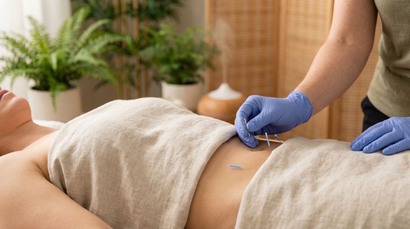 Un professionnel insère des aiguilles d'acupuncture dans l'abdomen d'un patient allongé pour traiter la constipation.