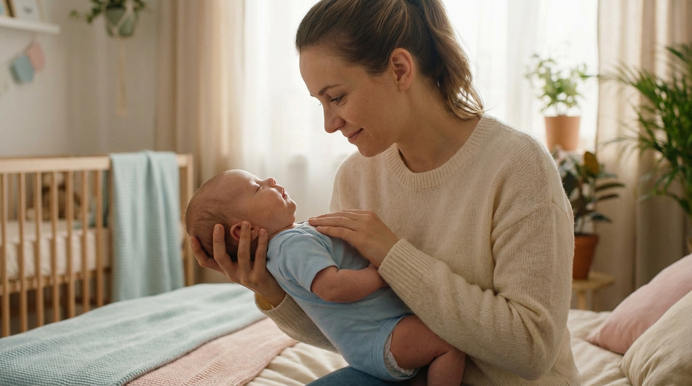Une mère souriante tient son bébé dans ses bras, le nourrisson avec la tête légèrement en arrière, dans une chambre lumineuse.