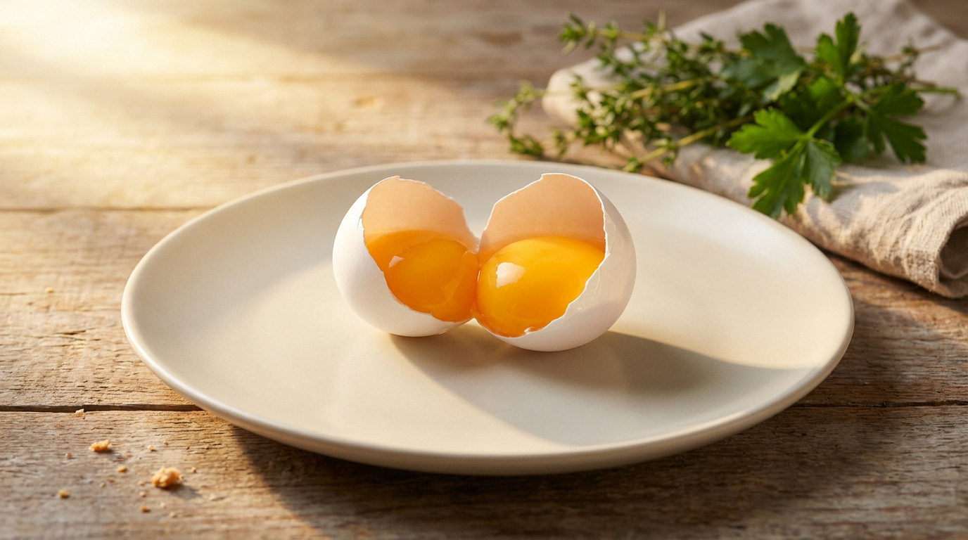 Freshly cracked egg with two perfect yellow yolks on a ceramic plate, rustic table, soft golden light, herbs.